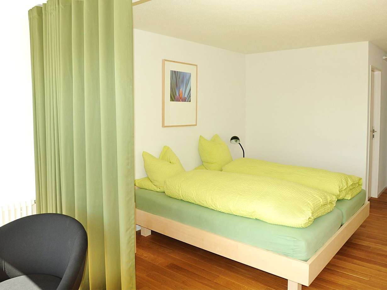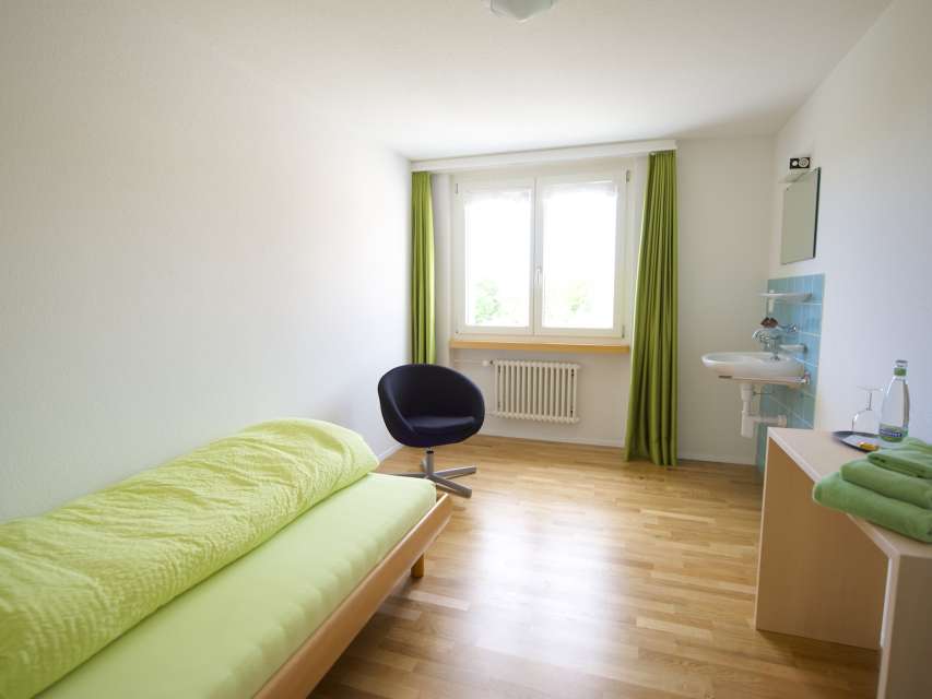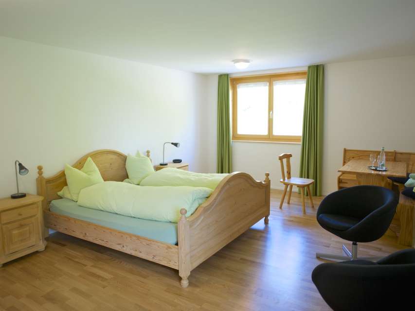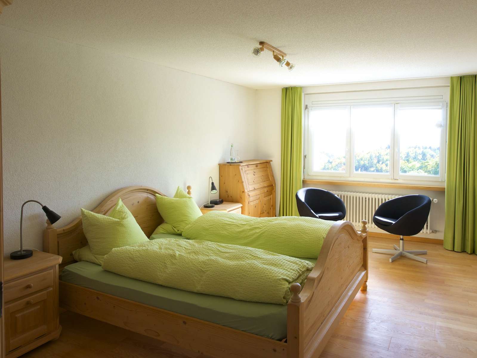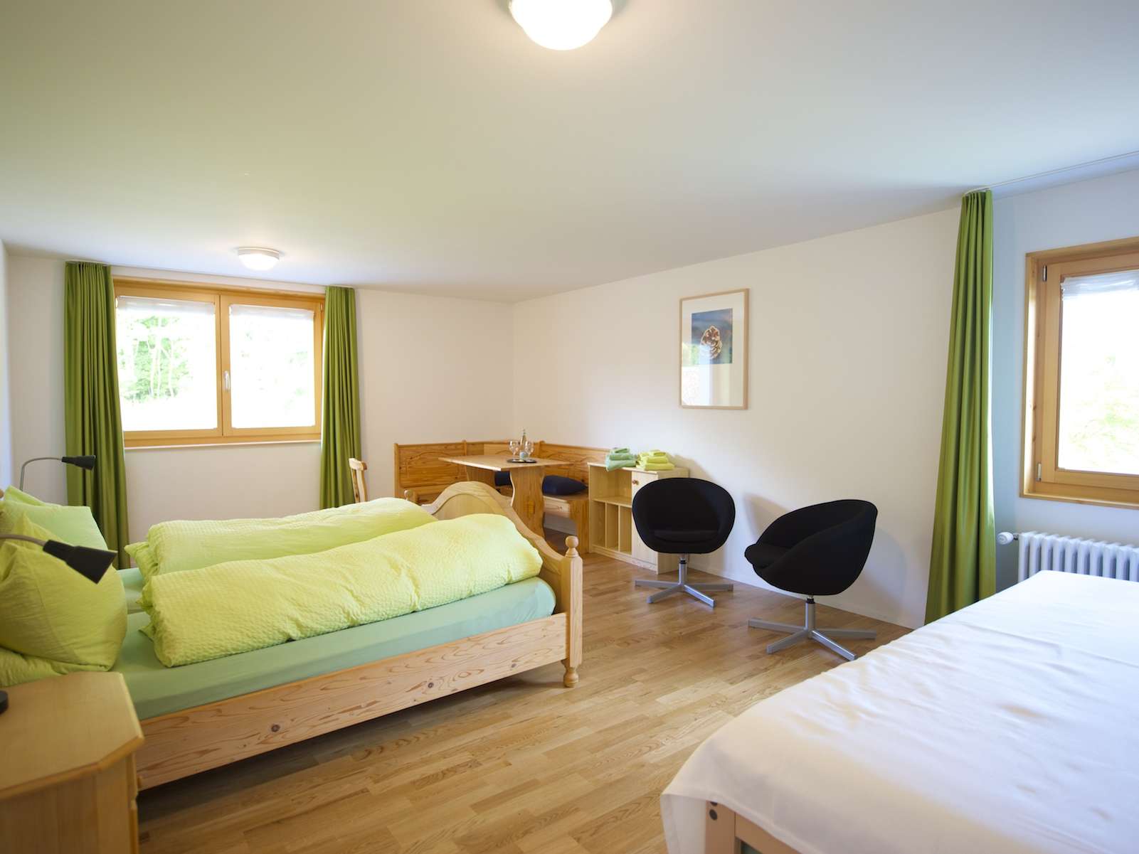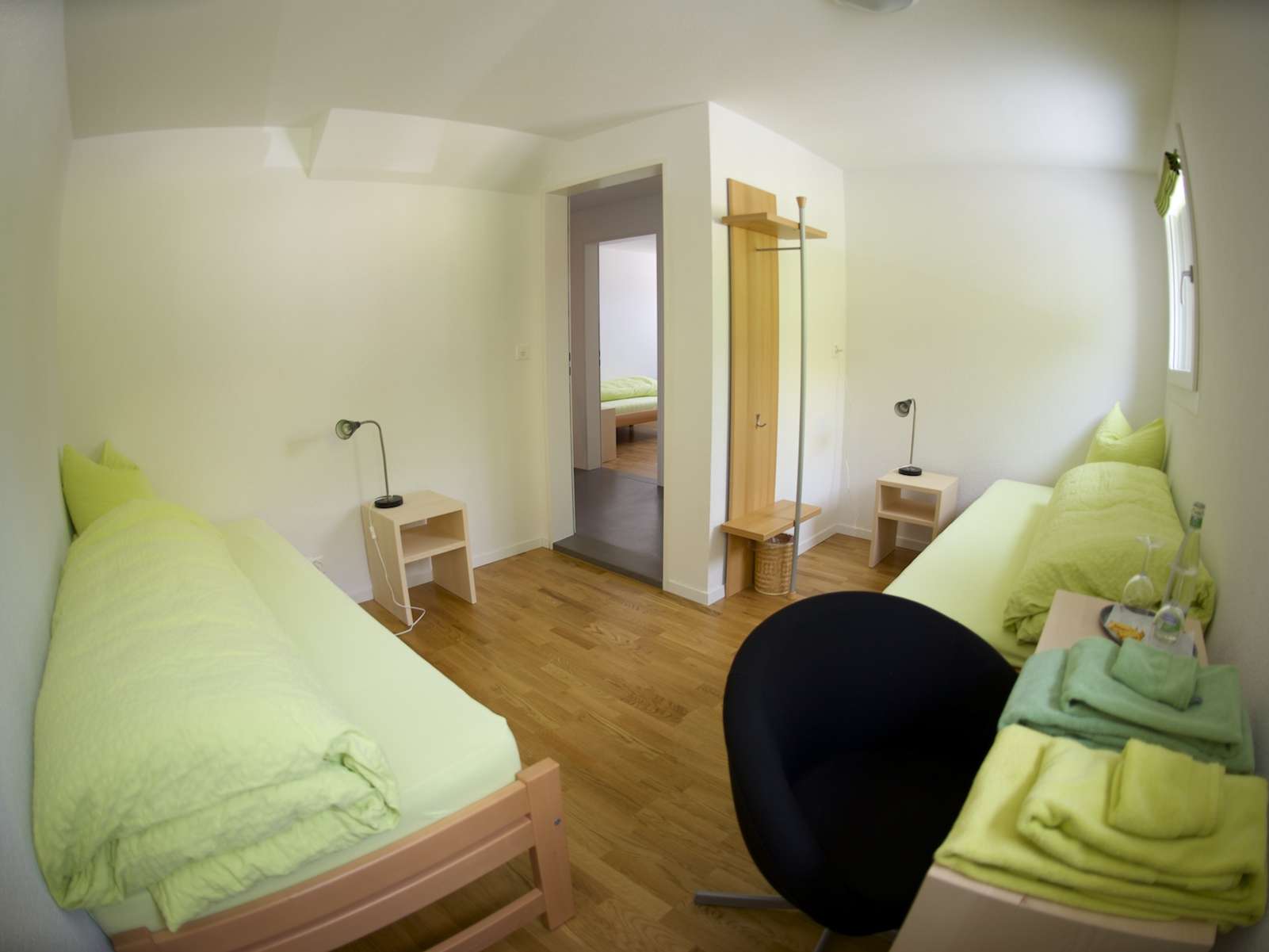 Sie sind alle mit einem Schweizer Eichenparkettboden ausgestattet und die Möblierung ist aus Ahornholz vom Randen. Alle diese Zimmer verfügen über eine Dusche/WC. Die Heizung und das Warmwasser wird durch Sonnenenergie und Holz erzeugt.